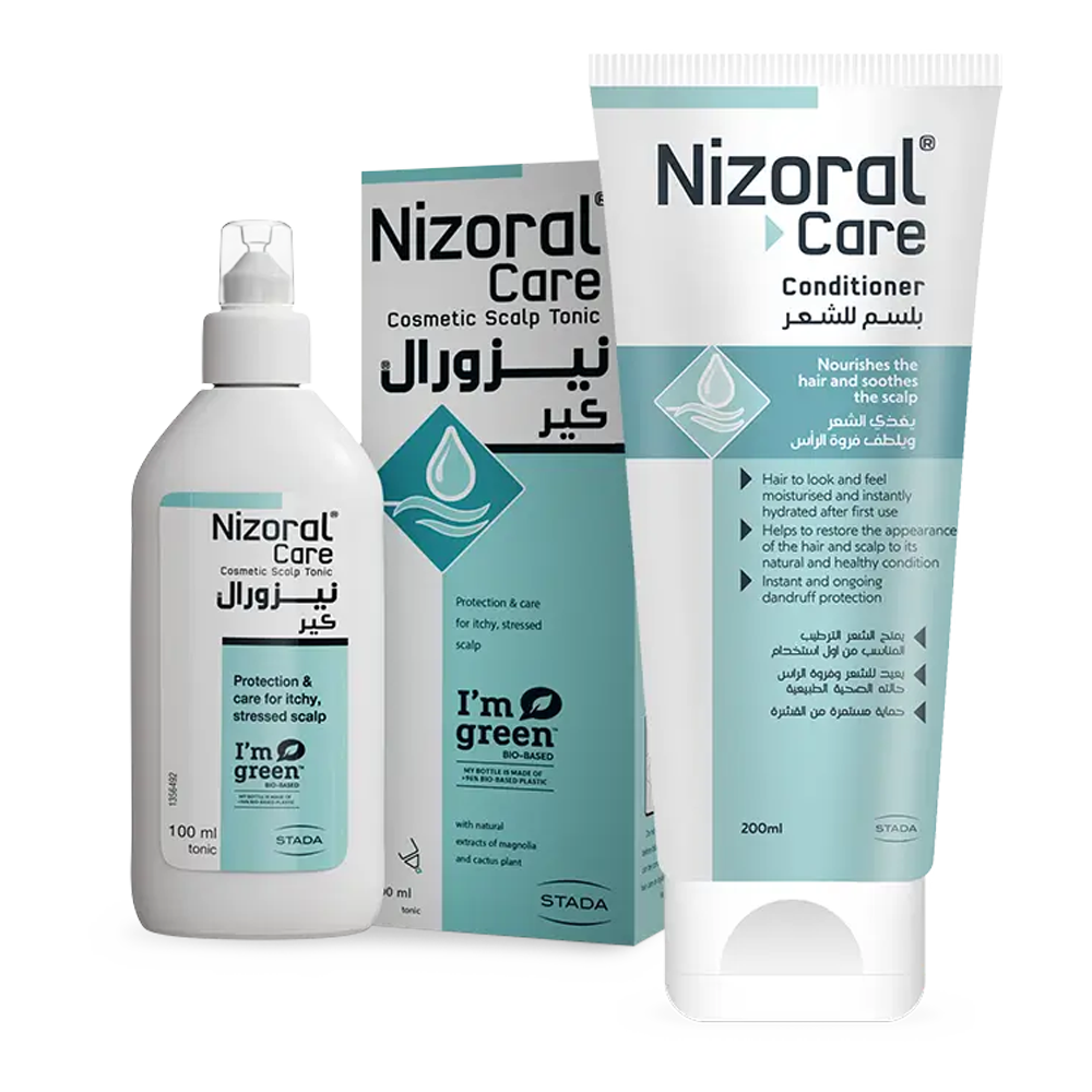Rebalance and soothe your scalp with Nizoral® Care Scalp Tonic & Nizoral® Care Conditioner, leaving it refreshed and moisturized.